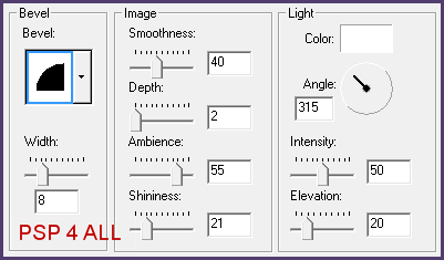 Maintenant rouvrir tous les calques. Tube : Avec la baguette magique, cliquer à l'intérieur du UFWonderlandframe1, puis Sélections > Modifier > Agrandir par 10 et ajouter la tête de votre tube. Sélections > Inverser et cliquer sur la touche Suppr de votre clavier. Sélections > Tout désélectionner. Puis placer ce calque sous UFWonderlandframe1. Sur la palette calques, mettre la visibilité de votre tube à 45. UFWonderlandkeyhole : A ajouter en nouveau calque à gauche puis le redimensionner à 90%. Votre tube à droite. UFWonderlandcluster : Ajouter comme nouveau calque puis redimensionner à 90%. UFWonderlanddoodle : Ajouter comme nouveau calque à gauche puis redimensionner à 90%. La Bulle : Cliquer sur l'outil Forme et choisir la Bulle de pensée. La dessiner de droite à gauche pour bien positionner les plus petites bulles. Ajouter le texte du scrapkit UFWonderlandwordart4 ou le texte de votre choix. ETAPE 4 : Crédits & Nom Crédits : Choisir une petite police comme Pixelette en taille 6. Nom : Police Beyond Wonderland ou celle de votre choix. Taille 68 avec l'anti-alias et couleur #9C1E1F. Puis ajouter un effet de biseautage. Effets > Effets 3D > Biseautage Intérieur :