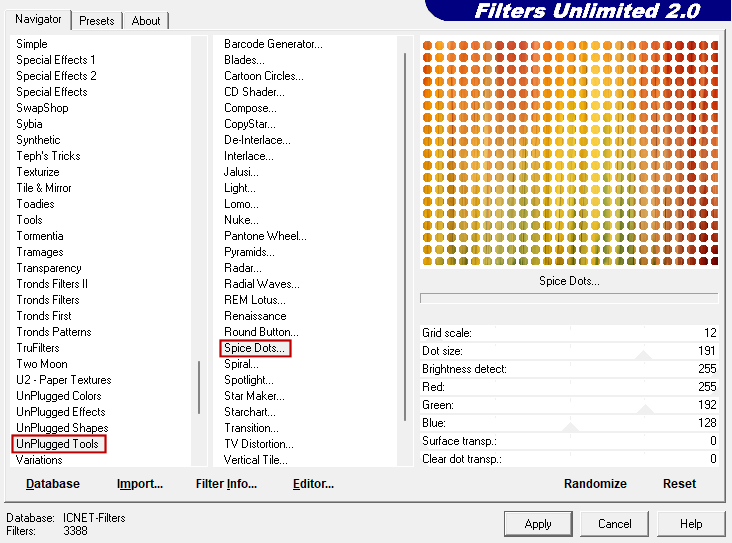 33. Et j'ai aussi coloré la feuille Leaf avec #BA4106. 34. J'ai utilisé #563A1B pour les calques Happy et Y'ALL. 35. Appliquer le même Gradient Glow sur ces 2 calques. 36. text FALL border - Réorganiser > Placer en haut de la pile. 37. Répéter pour ces calques : text Fall, text - Happy et text - Y'all. En haut de la pile. 38. Activer le calque text - Y'All. 39. Puis Calques > Fusionner le calque de dessous. 40. Refaire cette fusion 2 fois de plus pour avoir sur le même calque Happy FALL Y'All. 41. Déplacer ce texte Happy FALL Y'All vers la gauche. 42. text - mini - colorer en noir et appliquer le même Gradient Glow. 43. text - top right et text - top left. Appliquer le même Gradient Glow. 44. Ajouter le tube au milieu. ETAPE 4 - Le masque 45. Activer le calque White background et ajouter un calque. 46. Sélections et remplir avec paper_8. 47. Appliquer FU2 > UnPlugged Tools > SpicedDots - configuration par défaut