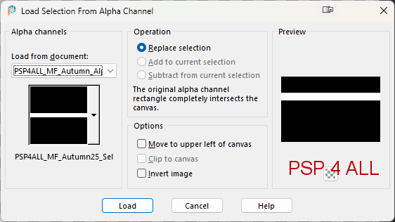 9. Apply AP01 > Innovations > Noise - Gritty on Overlay 10. Add a layer and fill with black. 11. Open mask Miz_Mask_054. 12. Layers > New Mask Layer > From an image and choose Miz_Mask_054. 13. Click OK. 14. Layers > Merge group. 15. Selections > Load/ Save a selection > Load Selection From Alpha Channel. Select PSP 4 ALL_MF_Autumn25_Sel # 1. 16. Click on Load.