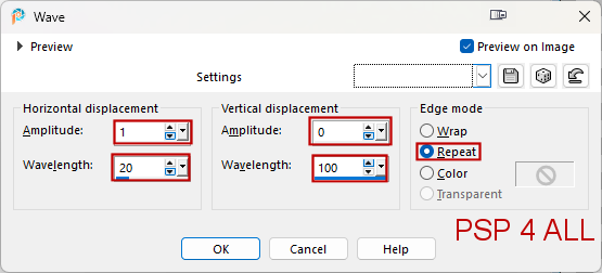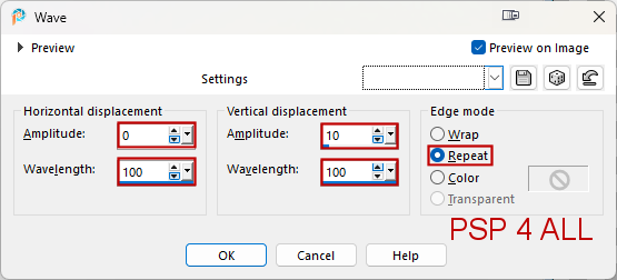25. Selections > Load/ Save a selection > Load Selection From Alpha Channel. Select PSP 4 ALL_MF_Autumn25_Sel # 2. 26. Click on Load. 27. Add a layer and fill with #611e11. 28. Selections > Select None. 29. Apply Effects > Distortion > Waves