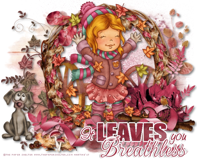Press any key to close the Pick Tool. Autumn Romance - ele12 - On top. Autumn Romance - ele35 - 55%. Move this layer to place it under the frames and in the middle. Autumn Romance - ele7 - 70%. In the middle. Layer Palette. Click on the Top Layer. Autumn Romance - ele20 - 15%. Bottom left. Image > Duplicate. Image > Mirror Horizontal. Autumn Romance - ele13 - 35%. Top, left on the frames. Autumn Romance - ele57 - 45%. Bottom left on the frame. Image > Duplicate. Image > Mirror Horizontal. Autumn Romance - ele29 - Bottom of the frames, on the right so it is visible. See my tag. Autumn Romance - ele46 - 35%. Bottom right. Add your tube. Autumn Romance - ele23 - 60%. Bottom right. Autumn Romance - ele15 - 80%. Bottom. Autumn Romance - ele62 - 30%, on the left. Autumn Romance - ele22 - 8%. Bottom, on the ribbon. Autumn Romance - ele66 - 7%. Bottom left. Autumn Romance - ele25 - 7%. Bottom left. Autumn Romance - ele44 - 10%. Bottom left. STEP 2: Wordart and Credits Wordart : WAbyChich "It leaves you breathless". Adjust > Hue and Saturation > Colorize - Hue at 246 and Saturation at 148. Apply Eye Candy > Gradient Glow.