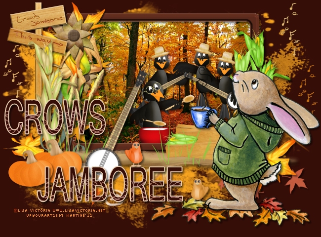 Open the photo of your choice. Edit > Copy. Click inside the frame with your Magic Wand and then Selections > Increase by 8 pixels. Add a layer. Edit > Paste Into Selection. Selections > Select None. Do not forget the Drop Shadow on the frame. scattered - 15%. Image > Flip. Colorize with #5F2C1D, Hue at 9 and Saturation at 136. Position on the right, just under frame 1. cluster 4 - 15%. On the left, above the frame. sign - 17%. On the left. corn stalk 2 - 10%. On the left. music notes - 15%. Colorize with #BD6D12: Hue at 22 and Saturation at 211. On the right. music notes - 15%. Colorize with #E1B46A: Hue at 6 and Saturation at 189. On the right. Duplicate and place the copy on the left. leaf - 15%. Bottom right. cluster 2 - 15%. Bottom right of the frame. Add the 3 other crows. All 3 above the photo but below the frame 1 layer: crow - 12%. strummin' - 12%. Image > Mirror. drummin' - 15%. banjo - 15%. Bottom left. Rotate right 115°. pumpkin - 12%. On the left. pumpkin - 10%. On the left. banjo - 15%. Bottom left. wordart - 15%. Bottom left. I split the 2 words so I could place them where I wanted. And I also replace the origianl colour #5F2A1C with #360E08. bird - 8%. Add your tube. bird - 8%. Colorize with #EE6418, Hue at 15 and Saturation at 220. STEP 4: Credits Credits: with the font Pixelette or any other pixel font.