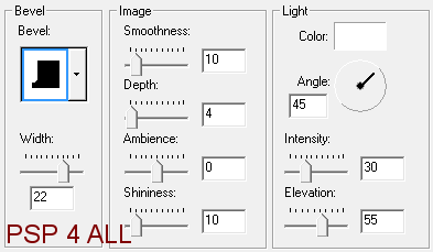 frame 1 - 20%. Place towards the top. Selections > Select All. Selections > Float. Selections > Defloat. Selections > Select None. Fill with #5F2C1D and apply an Inner Bevel. Effects > 3D Effects > Inner bevel:
