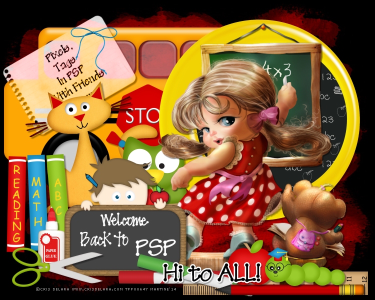 Element 21 - Sélection autour du mot STOP puis copier coller comme nouvelle image. Sélections > Désélectionner tout. Image > Miroir. Cliquer sur le mot STOP Puis faire Edition > Copier et remettre le mot STOP sur le bus. Redimensionner à 45%. Placer le bus sur votre travail, vers le haut. Frame 9 - A 25%. Mettre à droite. Avec la baguette magique, cliquer à l'intérieur du frame. Sélections > Modifier > Agrandir par 6 pixels. Ajouter un calque. Puis prendre l'outil pot de peinture et remplir la sélection avec le paper8 à 30%. Sélections > Inverser. Cliquer sur Supprimer. Sélections > Désélectionner tout. Element 12 - A 15%. En haut, à gauche. Ajouter le texte de votre choix avec la police TinkerToy. J'ai choisi Pixels, Tags, In PSP with Friends. Rotation à gauche de 30°. Mettre ce calque sur Luminance. Element 33 - A 10%. Mettre ce noeud dans le coin, en haut et à droite. Element 46 - A 15%. Mettre à gauche. Element 28 - A 18%. Element 14 - A 28%. Mettre les livres à gauche. Element 25 - 8%. En bas et à gauche. Element 6 - 50%. En bas. Avec la baguette magique, sélectionner autour du mot School et remplir avec #444444. Sélections > Désélectionner tout. Ecrire PSP à la place. Element 18 - A 12%. En bas, à gauche. Element 22 - A 20%. En bas, au milieu. Rotation 90° à gauche. Element 24 - A 20%. Rotation 75° à gauche. Element 7 - A 45%. Image > Miroir. Element 16 - A 10%. La pomme, à droite. Element 29 - A 10%. A droite. ETAPE 3 : Votre texte et Crédits Le texte de votre choix avec la police TinkerToy. Puis appliquer un Eye Candy > Gradient Glow.