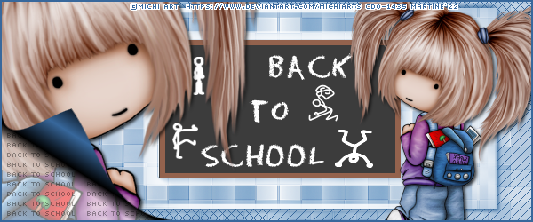 Selections > Promote Selection to Layer. Fill with #93624D. Selections > Modify > Contract 6 pixels. Delete. Fill with #3C3C3C. Selections > Select None. STEP 2 - Text, Tubes and Credits Text: Add a layer and write your text. I wrote Back to School with the Eraser font in white. I used the font Stick Figures to draw a few figures. Credits: with the font Pixelette or any other small pixel font. Tube: on the left à gauche a close up of the tube. And a smaller version of the whole tube on the right. Add a Drop Shadow: 2, 2, 75, 5. STEP 3 - Corner and Border Corner: Edition > Copy special > Copy merged. Edition > Paste As New Image. Duplicate. On the copy: apply Effects > Image Effects > Page Curl