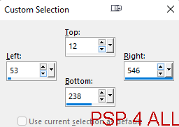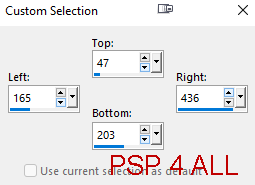 Layers - Add a layer > Fill with #FFFFFF (blanc). Open NarahsMasks_1450. Mask Layer > From an image and choose NarahsMasks_1450. Click on OK. Layers > Merge Group. Layers > Merge visible. Selection tool > Custom Selection