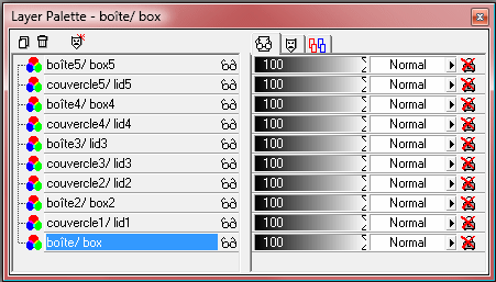 I decorated the background. You decide if you want to add a little pattern or not. If you do, add a layer before you start. Make sure you use a layer for the lid and then a different one for the box. Save your work as BiB1.psp. Then Window > Duplicate. Close your original image: BiB1 and move onto the copy. Save it as BiB2.psp. We will work on this one. First delete the Background layer right at the bottom, we don't need it. Then close the box layer and also the layer with the pattern on the box, if you have added a pattern. Merge visible the other layers and name this new layer Lid5. Close the Lid5 layer and open all the other layers. Merge visible these open layers and name the new merged layer Box5. Time to duplicate these two layers so we can create the final animation. Click on the Layer Palette. You have two layers: Box5 and Lid5. Right click on each layer and duplicate until you have four new copies of each. You will end up with ten layers, 5 of each. Name them as I did and arrange them exactly like mine.