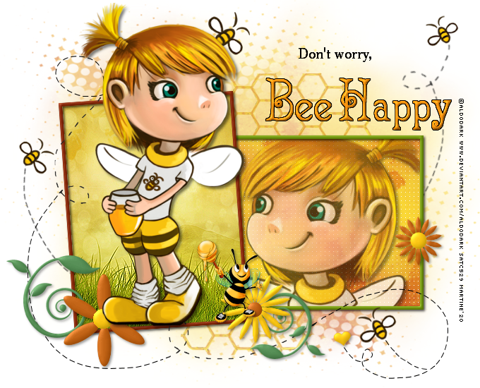 frame 2 : #6e920a. Ombre Portée : 2, 2, 70, 5. frame 1 : #BD5D0E . Ombre Portée : 2, 2, 70, 5. flower 1 (rose) : #BD5D0E et #F7C20E. Ombre Portée : 2, 2, 40, 5. blue flower (fleur bleue) : #F7C20E et #BD5D0E. Ombre Portée : la même. yellow flower (fleur jaune) : #BD5D0E et #F7C20E. Ombre Portée : la même. tiny heart (petit coeur rose) : #F7C20E. Ombre Portée : la même. swirl leaf 1 et swirl leaf 2 : j'ai gardé le vert et ajouté le biseautage. Ombre Portée : la même. J'ai supprimé le calque bumble bee et le calque wings et utilisé les abeilles du tube. Elément 027ef = 12%. Ombre Portée :la même. J'ai sélectionné et collé des petits bouts de doodle swirl pour rajouter à mes abeilles. ETAPE 5 - Word Art Sélectionner le texte Bee Happy. Ajouter un calque. Remplir avec #fc940d. Sélections > Modifier et agrandir 1 pixel. Remplir de noir. Glisser ce calque noir sous le texte. Supprimer le texte original. ETAPE 6 Crédits : avec une police comme Pixelette ou toute autre petite police pixel. Enregistrer votre travail. Martine 17 juin 2020 Si vous avez des questions, n'hésitez pas à me contacter. ![]() ![]() |