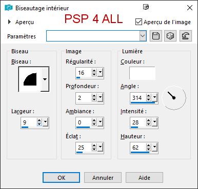 Ajouter le gros plan de votre tube. Opacité à 71. Ombre Portée : 3, 3, 50, 5. Supprimer le calque original. Cliquer sur le calque frame 1 fill. Sélections > Sélectionner tout. Sélections > Flottante. Sélections > Statique. Cliquer sur le papier paper 003. Copier coller dans la sélection. Sélections > Ne rien sélectionner. Effets de bord > Accentuer. Ajouter votre tube. Ombre Portée : 3, 3, 50, 5. ETAPE 4 - Les bordures et les fleurs A chaque fois la même méthode. On sélectionne. On ajoute un calque. On remplit de couleur. On applique un biseautage intérieur. (voir ci-dessous) On supprime la sélection et le calque original. On applique une ombre portée.