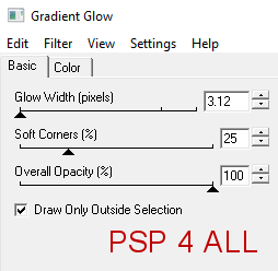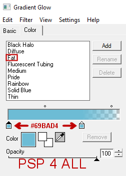Ajouter un calque et remplir avec #69BAD4. Sélections > Sélectionner tout. Sélections > Modifier > Contracter la sélection 1 pixel. Cliquer sur Supprimer. Sélections > Ne rien sélectionner. Calques > Fusionner > Fusionner le calque de dessous. Appliquer Eye Candy 4000> Gradient Glow