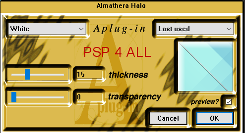 Dupliquer ce calque. Image > Redimensionner 90%. Sur la copie - renommer Fond 2, faire Sélections > Sélectionner tout. Sélections > Flottante > Sélections > Statique. Appliquer Almathera > A Halo...