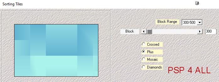 ETAPE 1 - Le fond Ouvrir une image couleur #FFFFFF, 800x500. Ajouter un calque. Renommer Fond 1. Choisir 2 couleurs de votre tube - couleur avant plan : #9DC2D2 et arrière plan : #ABF2EC. Préparer un dégradé linéaire angle 0 et répétition 0. Remplir le calque avec le dégradé. Appliquer Mehdi > Sorting Tiles