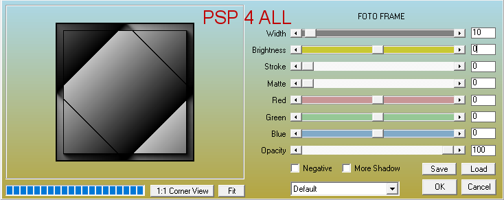 43. Press the M key to disable the Pick tool. 44. Duplicate and Image > Mirror horizontal. 45. Add a layer. 46. Selections > Load/ Save selection > Load Selection from disk 47. Choose selection PSP4ALL_MF_BnW_Sel2_mf25.PsPSelection. 48. Fill with the black and white gradient. 49. Apply Eye Candy 5 Impact > Glass - Select my preset PSP4ALL_MF_BnW_mf25. 50. Selections > Select None. STEP 3 - Decos, Tube and Texts 51. Copy Paste Déco1 as a new layer. 52. With the Pick tool - hit the K Key, modify lmodify Position X and Position Y.