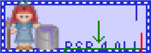 Et maintenant nous allons déplacer notre texte. Verifiez bien que tous vos calques soient fermés. Les seuls ouverts sont votre première copie de Blinkie1 et votre première copie de votre Texte. Exactement comme au-dessus. Zoomez pour agrandir si nécessaire. Maintenant cliquez sur votre texte et déplacez le vers le bas de 3 pixels. Fusionnez visible vos deux calques, renommez: j'ai mis PSP1. Fermez ce calque. Ouvrez les deux calques suivants: Copy of Blinkie2 et Copy of Texte.Cliquez sur le calque Texte et déplacez vers le bas de 6 pixels. A chaque fois on déplace de 3 pixels de plus que le calque d'avant. Et encore une fois fusionnez visible, renommez PSP2 et fermez ce calque. Ouvrez les deux calques d'après. Cette fois on retravaille sur une copie de Blinkie1. Et vous faites comme avant ctd vous déplacez votre texte encore une fois de 3 pixels en plus donc 9 pixels cette fois. Vous avez fait PSP3. Quand vous serez en train de travailler sur le blinkie d'après, vous allez voir que le Texte recouvre la bordure du blinkie. Alors effacez ce dont vous n'avez pas besoin comme ci-dessous: -j'ai encadré en vert! Ce que j'appelle Règle, ce sont mes 2 lignes verticales, une bleue et une rouge dont je me sers pour compter mes pixels quand je déplace mon texte. Je déplace ce calque Règle à chaque fois, et je le ferme toujours avant de fusionner.