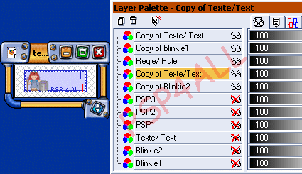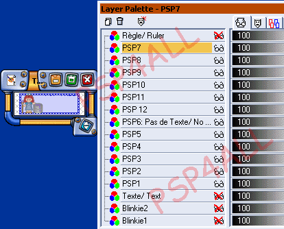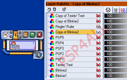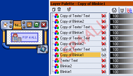 Vous continuez ainsi à alterner une Copie de Blinkie1 avec texte et une Copie de Blinkie2 avec Texte jusqu'à Blinkie PSP6 et en déplaçant votre texte de 3 pixels vers le bas. Et là vous n'avez pas besoin d'un calque Texte. Vous pouvez vérifier, si vous déplacez un calque Texte de 3 pixels de plus vers le bas, le Texte sera en dehors du blinkie. Donc pas besoin d'un calque Texte pour le blinkie PSP6. Pour ce blinkie, il y a juste une copie de Blinkie2 que j'ai renommé PSP 6: Pas de Texte.