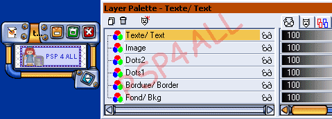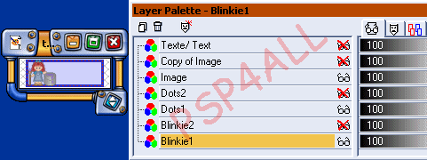 Vous allez maintenant fusionner visible: Blinkie1; Dots1; Image. Les autres calques sont fermés. Et renommez ce nouveau calque Blinkie1. Fermez ce calque et ouvrez: Blinkie2; Dots2 et Copy of Image. Fusionnez visible ces 3 calques et renommez Blinkie2. Sur votre palette calques, vous avez seulement 3 calques: Blinkie1; Blinkie2 et Texte. Vous allez maintenant faire des copies de ces trois calques et les arrangez comme ci-dessous en partant du bas: Copy of Blinkie1 et Copy of Texte/ Text. Copy of Blinkie2 et Copy of Texte/ Text Copy of Blinkie1 et Copy of Texte/ Text Copy of Blinkie2 et Copy of Texte/ Text etc..... Il vous faut un minimum de 6 copies de chaque calque Blinkie. En tout 12 calques Blinkies et 11calques Texte.Vous verrez pourquoi plus tard. Attention à bien les alterner comme ci-dessous, en partant du bas! Copy of Blinkie1 + Copy of Texte/ Text Copy of Blinkie2 + Copy of Texte/ Text Copy of Blinkie1 + Copy of Texte/ Text Copy of Blinkie2 + Copy of Texte/ Text Copy of Blinkie1 + Copy of Texte/ Text Copy of Blinkie2. Pas de Texte. ![]() Copy of Blinkie1 + Copy of Texte/ Text Copy of Blinkie2 +Copy of Texte/ Text Copy of Blinkie1 + Copy of Texte/ Texte Copy of Blinkie2 + Copy of Texte/ Text Copy of Blinkie1+ Copy of Texte/ Text En bas de ma palette de calques, j'ai gardé l'original de Blinkie1; Blinkie2 et une de Texte pour pouvoir faire des copies en plus, au cas où j'en aurai besoin. Mais ces trois calques sont fermés.