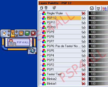 Il vous reste une chose à faire. C'est de déplacer vos calques, de les mettre où il faut pour avoir votre animation finale. Pour les déplacer sur votre palette calques, vous pouvez les faire glisser et les mettre où il faut ou bien si vous n'y arrivez pas, vous allez à Calques > Déplacer > Déplacer vers le bas. Arrangez les de façon à avoir le résultat suivant: Le dernier calque c'est à dire le calque12 doit être au-dessus de votre calque PSP6: Pas de Texte. Voir ci-dessous: