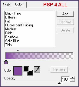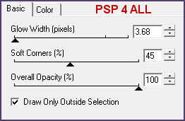 Dupliquer ce calque. Cliquer sur le calque du haut puis Calques > Propriétés > Mode Mélange > Ecran. Fusionner visible ces deux calques. Déplacer ce calque fusionné et le mettre sous le SBJ_Cluster Frame. Le cadre Cercle : SBJ_Wire Circle Frame 2 à redimensionner à 70% puis à recolorer comme précédemment. Ajouter comme nouveau calque à droite des 3 cadres. Cliquer à l'intérieur puis Sélections > Modifier > Agrandir par 4. Copier un des papiers : SBJ_Paper 13a et cliquer sur Sélections > Inverser et puis la touche Suppr de votre clavier. Appliquer l'effet Color Dot comme au-dessus. Placer ce calque sous le Wire Circle Frame. Ajouter votre tube au-dessus du Wire Circle Frame. ETAPE 4 - Les éléments Les fleurs à droite : SBJ_Flower - la 1ère redimensionnée à 18% et l'autre à 10%. Calla Lily que vous recolorez et puis redimensionner à 20%. Recolorer les fleurs si nécessaire. Le Papillon à droite : SBJ_Butterfly redimensionné à 7% et recoloré si nécessaire. Le candélabre et bougies : SBJ Candles à 35% puis recolorer les bougies si nécessaire. Utiliser l'outil Lasso pour sélectionner ce que vous souhaitez recolorer. Le Corbeau : SBJ_Crow à 18%. Le Chat : SBJ_Cat à 25%. Le lierre : SBJ_Ivy 1 à 75%. A positionner à gauche sous les cadres et au-dessus du calque Chicken Wire. J'ai sélectionné le surplus tout en bas et je l'ai supprimé. Dupliquer ce calque puis Image > Miroir et positionner à droite sous les fleurs. ETAPE 5 Redimensionner tous les calques de 75 à 80% à votre choix. Ajouter une ombre portée sur les éléments fleurs, le papillon, le lierre et le tube principal H : -2 et V : 0 O : 40 et F : 3 Texte/ Nom et Crédits : Ne pas laisser le tag vide. Texte et nom avec la police Beyond Wonderland - Taille 60 - #000000 pour le nom. Mon texte Broken Inside est en taille 48. Cochez l'antialias. Puis appliquer un Gradient Glow sur le texte et votre nom. Effets > Modules Externes > Eye Candy 4000 > Gradient Glow :