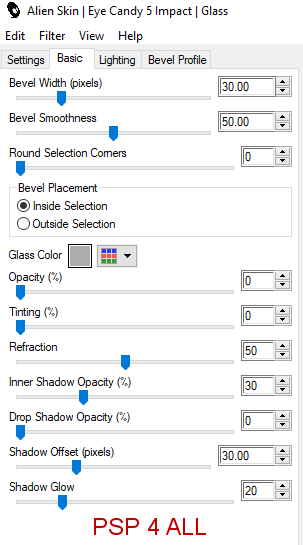 Ajouter un calque et faire clic droit pour remplir avec la couleur d'arrière-plan. Sélections > Modifier > Contracter de 4 pixels. Renommer ce calque Bordure. Ajouter un calque et clic gauche pour remplir avec la couleur premier plan. Ajouter un calque. Renommer Image. Cliquer sur votre image Paysage d'hiver. Edition> Copier. Revenir sur votre travail. Edition > Coller dans la sélection. Propriétés du calque > Mode Mélange sur Lumière Douce. Ajouter un calque et renommer Verre. Appliquer Eye Candy 5 Impact > Glass. Cliquer sur Settings et choisir le preset PSP4ALL_MF_Xmas8Ellipse_mf19. Et puis OK. Ou mettre ces coordonnées vous-même.