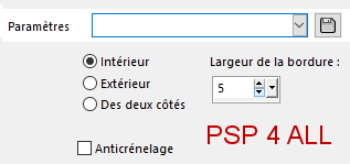 Sélections > Ne rien sélectionner. Dupliquer > Image > Retourner > Renverser verticalement. ETAPE 4 Cliquer sur Sélections > Charger/ enregistrer une sélection > Charger la sélection à partir du disque. Sélectionner les 2 lignes PSP4ALL_MF_Xmas_Lines_mf19. Clic droit et remplir avec la couleur d'arrière-plan. Sélections > Ne rien sélectionner. Cliquer sur le calque Bordure et Calques > Reorganiser > Placer en haut de la pile. Calques > Fusionner > Fusionner le calque de dessous. Renommer Bordure. Avec la baguette magique - Mode: Remplacer/ Tolérance = 0 Et Contigu, cliquer entre les deux lignes. Ajouter un calque et remplir de blanc. Glisser ce calque sous le calque Bordure. Mettre l'opacité à 50. Avec la police Script MT Bold, écrire mon texte ou celui de votre choix - Anticrénelage sur Net et Création sur Flottant. Le texte toujours sélectionné, cliquer sur Sélections > Charger/ enregistrer une sélection > Enregistrer la sélection sur un canal Alpha. Cliquer sur Suppr sur votre clavier. Puis revenir sur Sélections > Charger/ enregistrer une sélection > Charger la sélection à partir d'un canal Alpha. Cliquer sur la sélection de votre texte. Appliquer un Effet 3D > Découpe