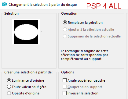 Clic droit et remplir avec la couleur d'arrière-plan. Sélections > Ne rien sélectionner. ETAPE 3 Cliquer sur Sélections > Charger/ enregistrer une sélection > Charger la sélection à partir du disque. Sélectionner l'ellipse PSP4ALL_MF_Xmas_Ellipse_mf19