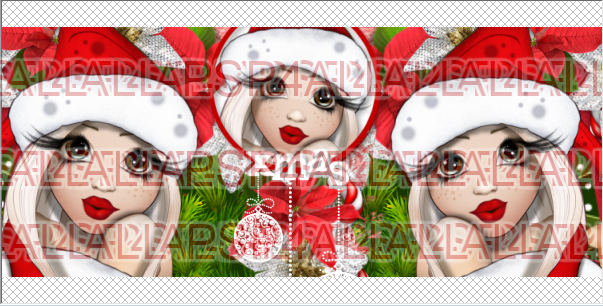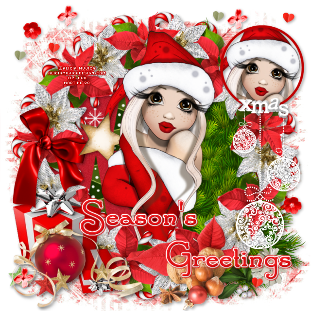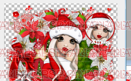 On va remplir cette couronne avec le papier Miz_Christmas_paper (9) - 85%. J'ai utilisé l'outil Lasso et me suis mise au milieu d'une fleur. J'ai tracé mon cercle en suivant tous les milieux des fleurs. J'ai copié collé le papier en nouveau calque. Sélections > Inverse et Supprimer. Glisser ce calque sous la couronne de fleurs. ETAPE 2 - Les éléments et le tube Ajouter le sapin Miz_Christmas_el (24) à droite au dessus du papier Miz_Christmas_paper (9). Miz_CR_element12 - 38%. Miz_CR_element6. Miz_CR_element29 - 45%. Et ces 4 petits éléments plusieurs fois, juste au-dessus des 2 masques. Miz_CR_element17 - 30%. Miz_CR_element24 - 12%. Miz_CR_element25 - 20%. Miz_CR_element31 - 20%. ---------- Miz_Christmas_el (1) - 55%. Miz_Christmas_el (18) - 40%. Miz_Christmas_el (6) - 35%. ---------- Ajouter le tube au milieu. Pour le petit cadre, en haut à droite. Tracer un cercle en rouge, épaisseur de 5 pixels. Diamètre de 210 pixels. Avec la baguette magique, cliquer à l'intéreur du cercle. Sélections > Modifier > Agrandir 3 pixels. Ajouter un calque et remplir de blanc. Glisser ce calque sous le cadre rouge. Garder la sélection. Redimensionner le tube, il doit être un petit peu plus petit et copier coller le tube en nouveau calque dans la sélection. Sélections > Inverser > Supprimer. Ajouter l'élément Miz_CR_element33 - 25% sur le cadre rouge. ETAPE 3 - Les décos et le Texte Le texte : Le mien ou celui de votre choix, en rouge. Appliquer un Gradient Glow Fat, blanc, 3.12. Puis un biseautage intérieur