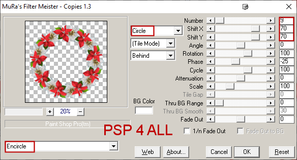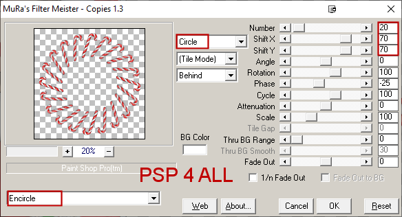 ![]() ETAPE 1 Ouvrir une image couleur #FFFFFF 800x800. On redimensionnera plus tard. Copier coller papier Miz_CR_paper 3 en nouveau calque. Calques > Nouveau calque de masque > A partir d'une image et choisir WSL_Mask368. Cliquer sur OK. Calques > Fusionner le groupe. Copier coller papier Miz_CR_paper 10 en nouveau calque. Calques > Nouveau calque de masque > A partir d'une image et choisir WSL_Mask368. Cliquer sur OK. Calques > Fusionner le groupe. Mettre le Mode Mélange de ce calque sur Couleur(héritée). Element 29 - 35%. Objets > Aligner > Centrer sur le support. Appliquer Mura's Meister > Copies > Encircle