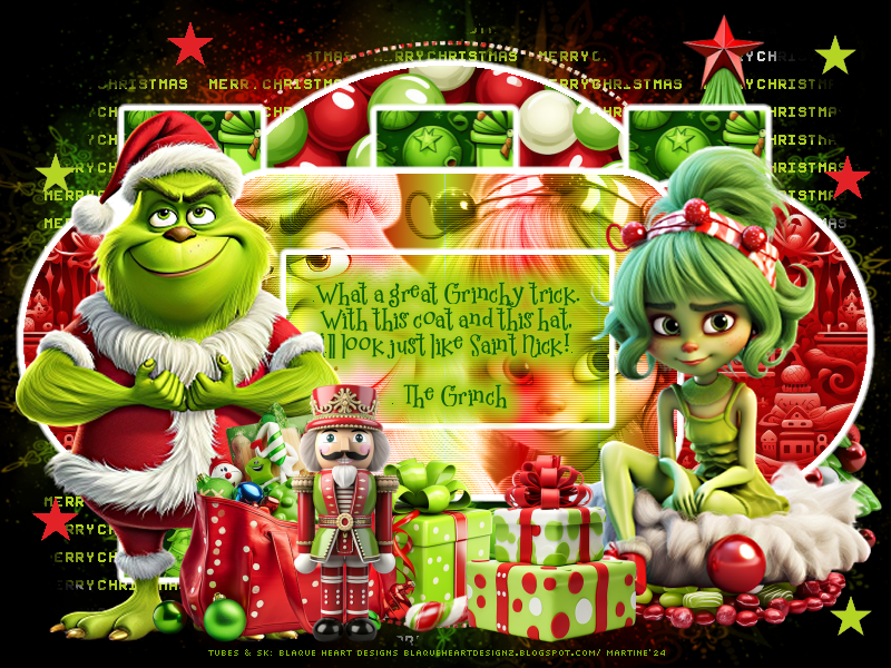 ![]() My image : PSP 4ALL Christmas Grinch_mf24. In the supplies zip with my WA. My mage has all the Alpha selections needed to complete my tutorial. Scrapkit: Grinch Please, IA scrapkit by Blake Heart sur son site Blaque Heart Designz. Plugins : Eye Candy 4000 > Gradient Glow Mura's Meister > Copies penta.com > VTR Mask: RD_Mask828 by Rachel - Rachel Designs. Supplies: