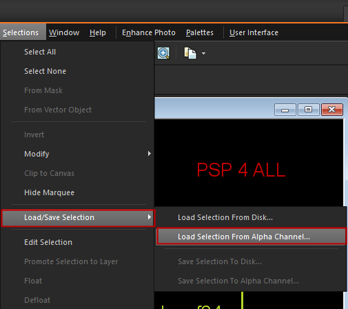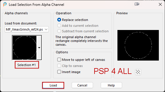 Fonts: 2 Peas Mister Giggles et Pixelette for the credits ****************************** Reminder: *** Depending on the colors & tube you are going to use, feel free to change the mode and opacity of the layers. *** I work from the bottom to the top. STEP 1 - Template 1. Open my image: MF_XmasG_mf24. It's the image we will work on. It contains the Alpha Selections needed to complete this tutorial. They are not visible and we will load them as we go alo,ng, later by layer. 2. Shift+D to duplicate. PSP 4ALL Christmas Grinch_mf24. We work on the copy. 3. Delete the Credits layer right at the top: PSP 4ALL Christmas Grinch_mf24. 4. bkg. Leave black. 5. Layer 1 - Selections > Load/ Save Selection > Load selection from Alpha Channel