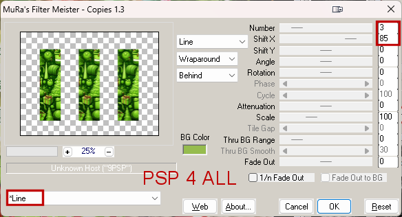 15. Layer 3 - In the Layers palette, click on Layer 3. 16. Selections and load Alpha Selection #3. 17. Resize BHD_GP-Paper (28) to 55% and paste as new layer. 18. Selections > Invert > Delete. 19. Selections > Select None. 20. Apply the same Eye Candy 4000 > Gradient Glow. 21. Mura's Meister > Copies > Line