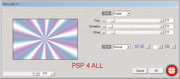 ![]() ETAPE 1 - Le fond Ouvrir une image couleur #FFFFFF, 800x500. En premier plan = #c49dc7 et en Arrière plan = #96b6d4. Appliquer Mehdi Wavy Lab 1.1. Mettre #FFFFFF pour la 3ème couleur