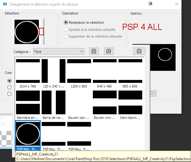 Ajouter un calque. Remplir de blanc. Ajouter un calque. Edition > Copier dans la sélection. Dupliquer. Calques > Fusionner le calque de dessous. Calques > Fusionner le calque de dessous. Renommer Fond 2. Ajouter un calque. Cliquer sur Sélections > Charger/Enregistrer une sélection/Charger la sélection à partir du disque. Choisir la sélection PSP4ALL_MF_Creativity21.PspSelection