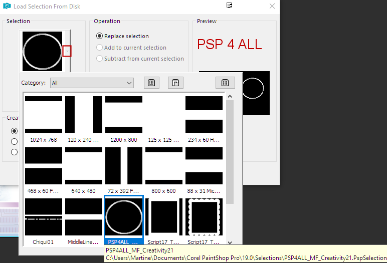 Add a layer. Fill with white. Add a layer. Edit > Paste into selection. Duplicate. Layers > Merge Down. Layers > Merge Down. Rename Background 2. Add a layer. Click on Selections > Load/ Save Selection > Load Selection From Disk. Choose PSP4ALL_MF_Creativity21.PspSelection