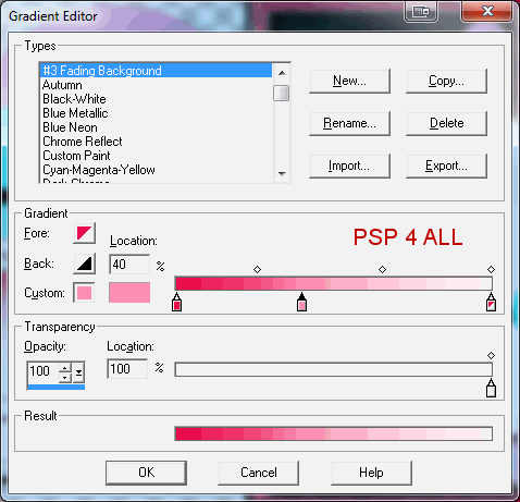 Fonts: Impact, Visitor TT2 BRK and Pixelette for the credits.You can download my E-Book which will let you work without being connected. STEP 1: Template Open the template. Duplicate and close the oiginal. Fill the background layer with #000000 for the results page. Delete the Crédits layer. Choose one colour of your tube as the main colour you will use throughout this tut. I chose #E70241. STEP 2: Multicolor Frame Select the white rectangle with your magic wand. Add a layer and fill with black #000000. click back on the original layer and select both the pink nd turquoise borders. Move back up onto the black layer and fill the selection with a gradient. I used my main colour #E70241, #FD8DB2 towards the middle and white at the end.