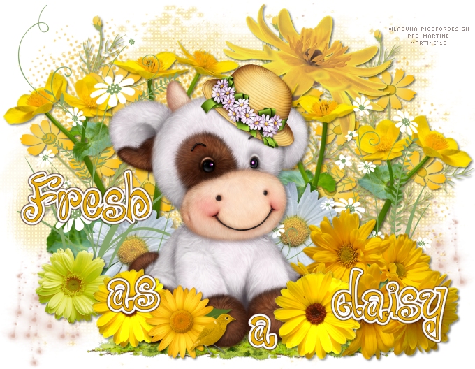 Calques > Nouveau calque de masque > A partir d'une image et choisir RD_Masks747. Cliquer sur OK. Calques > Fusionner le groupe. Mettre l'opacité à 36. ETAPE 2 - Ajouter ces éléments DA-FreshAsADaisy-element (022) - en bas. DA-FreshAsADaisy-embellishment (01) - Placer en bas à droite. Coloriser. Réglage > Teinte et Saturation > Coloriser avec la Teinte à 12 et la Saturation à 105. Dupliquer. Image > Mirroir. Mettre la copie en bas, à gauche. Sélections > Sélectionner tout. Ajouter un calque et copier coller ACD grunge splatterctions dans la sélection. Sélections > Ne rien sélectionner. ACD yellow daisies - 35%. LDGS_SYHOBT_Apr18_El02 - 20%. A droite. DA-FreshAsADaisy-element (019) - 75%. A gauche. Dupliquer. Mettre à droite. LDGS_SYHOBT_Apr18_El03 - 7%. A droite. Dupliquer. Mettre à gauche. ACD daisies - 35%. Au milieu. DA-FreshAsADaisy-element (020) - 60%. En bas, à droite. Ajouter le tube. DA-FreshAsADaisy-element (03) - 28%. A droite. DA-FreshAsADaisy-element (011) - 25%. A gauche. DA-FreshAsADaisy-element (03) - 25%. A gauche. DA-FreshAsADaisy-element (04) - 28%. A gauche. DA-FreshAsADaisy-element (016) - 15%. En bas. ETAPE 3 - Wordart DA-FreshAsADaisy-wordart (01) - 60%. Séparer en 3 mots et placer sur différents calques. Prendre le a de as et le mettre sue un autre calque. Appliquer Eye Candy 4000 > Gradient Glow sur les 4 mots.
