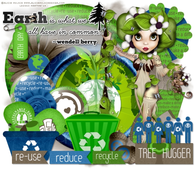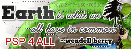 Frame3 - Top left Flower2. Frame1 - 75%. Below, towards the right. Flower3 - On the right. Inside Frame1, place the Earth element. Green Earth - In the middle of Frame1. Brad1 - On the left. Brad2 - towards the right. Flower1 - 60%. On the left. Heart. Arrow. 75% and on the right, towards the bottom. Add your tube. RecycleBin2 - 55%. Bottom left. RecycleBin1 - 55%. Acorn - 70%. Duplicate. Rotate 90° to the right. Re-Use - 75%. Reduce - 75%. Recycle - 75%. Tree Hugger - 75%. PaperDolls - 47% ETAPE 3: Text Word Art "Earth is what we all have ~ wendell berry" - 30%. Apply Eye Candy 4000 > Gradient Glow