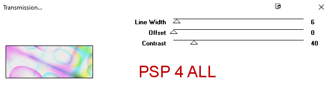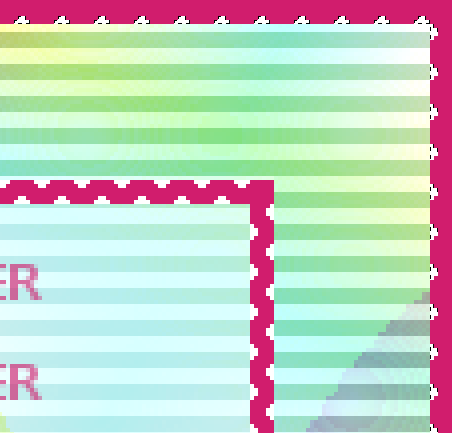 Bordure du haut : Sélections > Sélectionner tout. Ajouter un calque. Remplir avec #D11E6D. Sélections > Modifier > Contracter de 6 pixels. Cliquer sur Suppr. Sélections > Ne rien sélectionner. Appliquer AAA Filters > Good Vibrations. Même configuration. On va enlever le blanc de cette bordure. Avec la baguette magique, cliquer à l'intérieur de la bordure sur un des petits triangles blancs. Sélections > Modifier > Sélectionner les zones similaires - Non contigu.