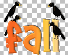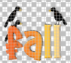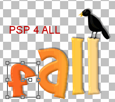 Then the same drop shadow. STEP 4 - Credits With a small pixel font like Pixelette. STEP 5 - Animation 1. In PSP Open a new image 400x400 and paste the Fall text as a new layer. Duplicate. close the copy. Activate the first layer, add one of the crows - resize to 13% and add on the L. Add a drop shadow on the crow. Merge visible these two layers then close. Open the second Fall text layer, add the other crow as a new layer, again resize it to 13% and add on the F. This time click on Image > Mirror. Add the same drop shadow. Merge visible. Close the second layer with the crow on the F. Click on the first layer and open. With the Freehand selection tool (Lasso tool)- point to point - select around the F. Then copy paste the selected F as a new layer, position it exactly on top of the other one. Delete the original F on the first layer. Click on the F layer then on the Raster Deform tool (Key stroke D - In PSP 7, the Deformation tool) and flatten the F