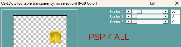purple square: Colorer les 2 carrés en jaune. Click to select. Add the head part of your tube, resized if necessary. Invert. Delete. Blend mode on Multiply or what suits your tube. Layers > Merge > Merge down. Apply Carolaine and Sensibility > CS-LDots