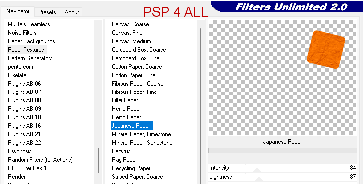 Close the watermark layer; the white rounded square - left layer and the white rounded square - right layer ;the orange rounded square - left layer and the calque orange rounded square - right layer. I kept all the orange layers but I colored all the purple ones in yellow. Orange and yellow are 2 colours in my tube. Yellow is #f9da28. Click on the bottom layer. We will work from the bottom to the top. Orange rounded rectangle - back right : FU2 > Paper Textures > Japonese paper