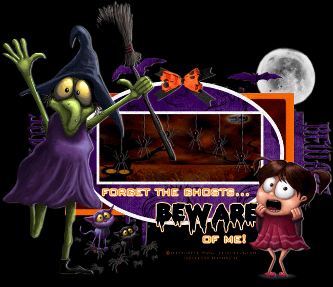 Walking spiders group - Tracy.F Designz-Spooktacular.spiders - resize to 30% and add the same drop shadow used for the other spiders. Position at the bottom, on the left. Bow- Tracy.F Designz-Spooktacular.bow4 - resize to 40% and position at the top above the oval border layer. Add this drop shadow, same white color:
