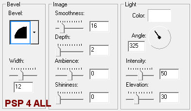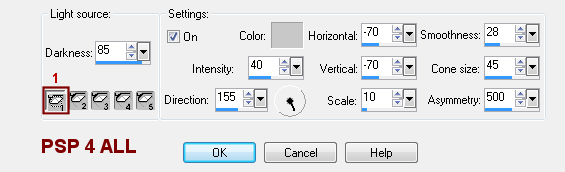 STEP 7: Add your tubes. Then apply the same drop shadow as on the bow. STEP 8: Resize your tag now if you so wish. Mine is at 75% of the original. STEP 9: Credits. Choose a small font like Pixelette in size 6. STEP 10: Getting your animation ready Close all the layers Images except for the Image1 layer. Activate the Image1 layer. Apply an Illumination effect. Click on Effects > Illumination effects > Lights (In PSP 7, it is under Effects > Illumination Effects > Lights). Settings as below. Click on Default and then select 1. Then click on OK.