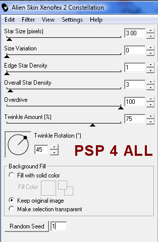 Nouveau calque et ajouter les crédits nécessaires avec Pixelette en taille 6 sans antialias. ETAPE 6 Effet Constellation : Se placer sur le calque Ciel. Faire 3 copies. Fermer tous les calques sauf le premier calque Ciel. Appliquer le filtre Alien Skin Xenofex 2 Constellation :
