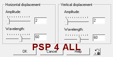 Remplir de blanc avec le pot de peinture. Puis Sélections > Modifier > Contracter par environ 12 pixels et puis cliquez sur Supprimer. Cliquer sur ce calque et dupliquer; se placer sur le calque original. Cliquer sur Couleurs ou Réglages > Teinte et Saturation > Teinte/Saturation> Luminosité et régler à -100. Le cadre est maintenant noir. Cliquer sur Effets ou Réglage > Flou > Flou Gaussien de 1. Fermer le fond et fusionner visible les deux cadres rectangulaires et renommez Cadre. Effet Vague : Appliquer l'effet Vague sur votre cadre. Effets > Effets Géométriques > Vagues (PSP 7) avec mes configurations ou celles de votre choix.