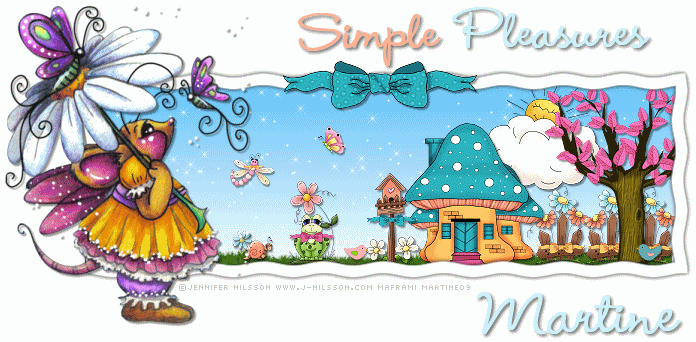 Simple Pleasures_SMar_15.png - redimensionné à 10% et à placer à droite. Simple Pleasures_SMar_7.png - redimensionné à 8% et à placer à gauche de l'arbre. Simple Pleasures_SMar_26.png - redimensionné à 5% et à placer à gauche de la maison. Simple Pleasures_SMar_25.png - redimensionné à 4%. Simple Pleasures_SMar_32.png - redimensionné à 5%. Simple Pleasures_SMar_13.png - redimensionné à 3%. Simple Pleasures_SMar_12.png - redimensionnés à 2%. Simple Pleasures_SMar_12.png - redimensionné à 10%. Simple Pleasures_SMar_20 & 21.png - redimensionnés à 3%. Simple Pleasures_SMar_18.png - redimensionnés à 5%. Faire deux autres copies et placer-les à droite de l'arbre et sous le calque arbre. Simple Pleasures_SMar_31.png - j'ai enlevé le texte - j'ai sélectionné avec l'outil lasso et rempli de la couleur du nuage pour couvrir le texte. Puis redimensionner à 8%. Image > Miroir et placer entre l'arbre et la maison et sous ces calques. ETAPE 5 Texte/ Nom et Crédits : Ne pas laisser le tag vide. Utiliser le WorArt Simple Pleasures ou comme moi faire votre texte avec la police Wendy Medium ou une autre de votre choix - Taille 60 - #FEB595 et #CAFDFE ou couleurs de votre choix avec antialias. Ajouter une ombre portée.