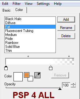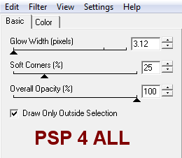 and add your name/text on a layer. Adjust in height and width if needed. Then click on Layers > convert to raster layer. Letters : Click on the Selection lasso tool. Go around the first letter then Edit > Copy > Edit > Paste as a new layer. Activate the texte layer and selct the second letter. Copy and paste as a new layer. Repeat for each letter in order to end up with each letter on a different layer. Close the layer with the name/ text in full. Arrange the letters as in my result above or as in my result at the bottom or as you wish. First Letter: Activate the layer with the first letter then Selections > Select All > Selections > Float > Selections > Defloat and paste the head part of the tube of your choice. Selections > Inverter > Click on Delete. Selections > Select None. Close the white background layer and merge visible the other 2 layers. Selections > Select All > Selections > Float > Selections > Defloat and Selections > Modify > Increase by 2 pixels. Add a new layer and fill with one of the colours of the tube you have just used, a bit darker if necessary so you can have more of a contrast. Selections > Select None and move this layer under the other. Merge visible these two layers. Apply Eye Candy Gradient Glow: Click on Settings and Reset to Factory Default Color: Click on Fat