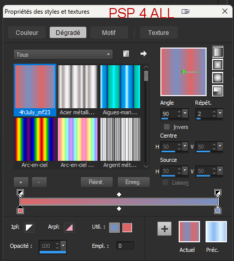 ![]() Matériel : Ma template: mypsp-template3_mf23; Mon wordart & le Masque que j'ai utilisé: Vix Mask 26. Télécharger ici. Filtres : Unplugged Tools > Interlace Eye Candy 6 > Text Selection > Gradient Glow Police : Pixelette pour les crédits. ****************************** Rappel : *** Comment colorer les calques - Pour remplir avec une couleur ou un papier, faire Sélections > Sélectionner tout. Sélections > Flottante > Sélections > Statique. Ou on peut aussi sélectionner avec la baguette magique. Ajouter un calque > Remplir avec la nouvelle couleur, le papier ou la texture. Appliquer le plugin si demandé. Sélections > Ne rien sélectionner. Supprimer le calque original. *** Selon les couleurs et le tube que vous allez utiliser, n'hésitez pas à changer le mode et l'opacité des calques. ETAPE 1 - Masque 1.Ouvrir la template. Shift+D pour dupliquer. 2. Supprimer le calque Credits. 3.White background - Ajouter un calque et remplir avec un dégradé linéaire fait avec 2 couleurs : rouge DD6768 et bleu 7790C3.