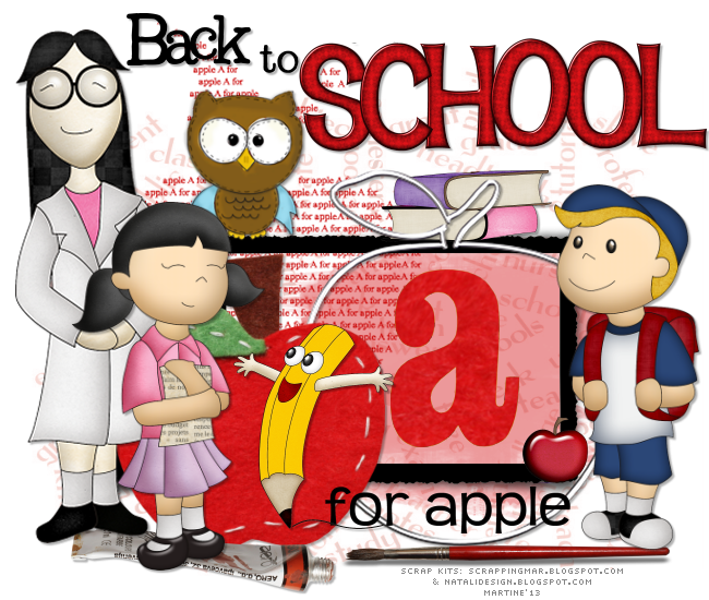 Vous pouvez faire ce que vous voulez de votre résultat : signatures avec nom, "extras" ou papiers, websets. Donnez tous les crédits nécessaires. ![]() Tube(s) de votre choix, gratuit(s) ou non, mais le crédit doit être mis sur votre tag. J'utilise des cliparts de ScrappingMar - http://scrappingmar.blogspot.com/. Freebie : Back to School - offert par Natali Design - Lien direct ici. Pas d'instructions! Vous téléchargez le mini-kit. A vous de travailler avec les éléments offerts pour faire un tag pour la rentrée. Vous rajoutez ce que vous voulez, vous appliquez les effets que vous voulez, vous animez ou non. Martine 19 septembre 2013 Si vous avez des questions, n'hésitez pas à me contacter. ![]() ![]() |