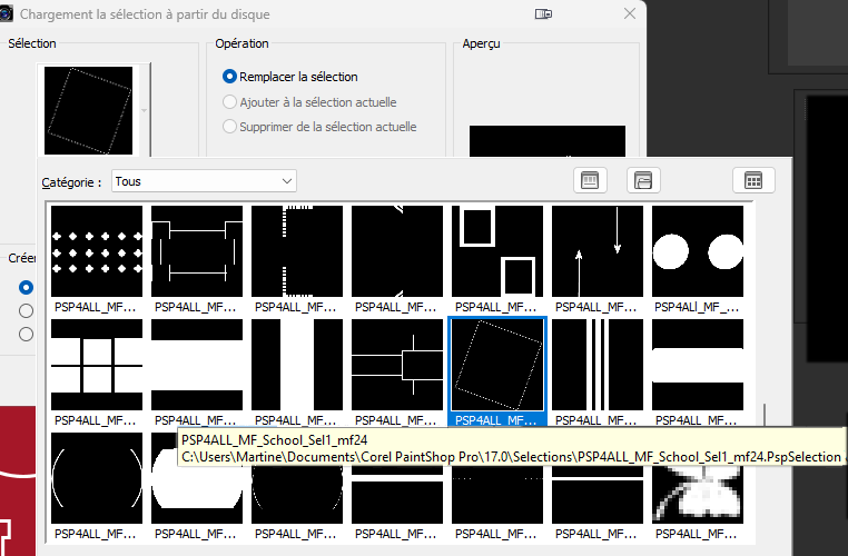 39. Calques > Fusionner le calque de dessous. 40. Supprimer right black square. 41. Ajouter un calque. 42. Sélections > Charger/ Enregistrer une sélection > Charger la sélection à partir du disque 43. Choisir la sélection PSP4ALL_MF_BTS_Sel1_mf24.PsPSelection.