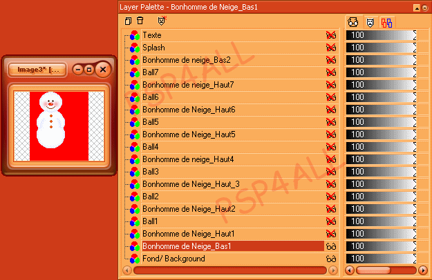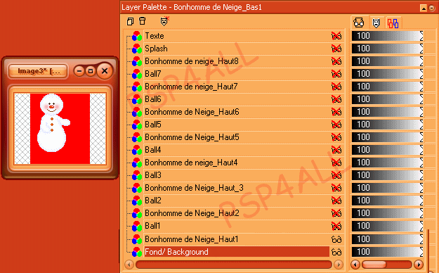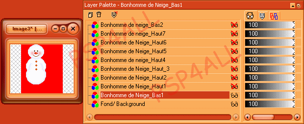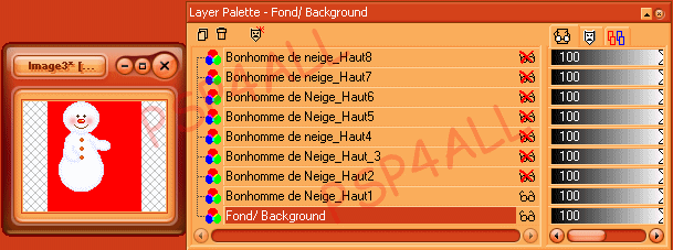 Vous vous servez de ce que vous voulez: un autre bonhomme de neige ou une petite doll. Ouvrez une nouvelle image transparente dans Paint Shop Pro: 120 x 120. Ajouter tout de suite un fond rouge pour pouvoir mieux voir et renommez ce calque: Fond. Puis au-dessus j'ai rajouté mon bonhomme de neige en faisant un copier-coller comme nouveau calque. Je me sers de 2 bonhommes de neige identiques, sauf un a le bras en bas et l'autre le bras levé. Mais vous pouvez vous servir d'une seule image, une où le bras est levé. Si vous vous servez de deux images, ce premier calque sera pour le bonhomme de neige avec le bras en bas. Appelez votre premier calque Bonhomme de Neige_bas1. Clic droit et dupliquez: Bonhomme de neige_bas2. Nouveau copier coller et rajouter votre deuxième bonhomme de neige, celui qui a le bras levé et renommez: Bonhomme de Neige_Haut1. De nouveau clic droit et dupliquer. Dupliquez 6 fois. Vous avez maintenant 7 copies de ce même Bonhomme de Neige_Haut. Au dessus de Bonhomme de Neige_Haut7, vous rajoutez le calque Bonhomme de Neige_Bas2.